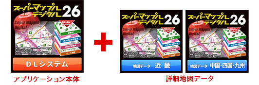 「アプリケーション本体」と「近畿 詳細地図データ」「中国・四国・九州 詳細地図データ」で西日本全域の詳細な地図情報がご利用いただけます。